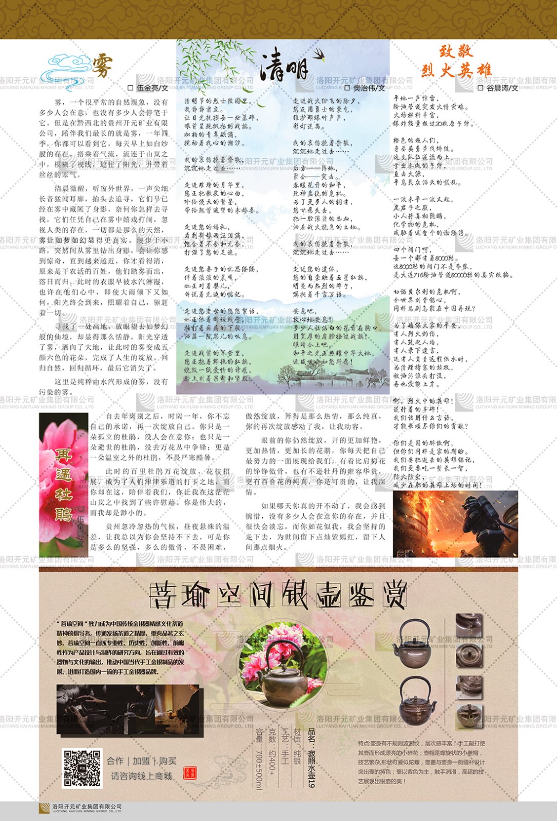 洛陽開元礦業(yè)集團(tuán)有限公司簡(jiǎn)介洛陽開元礦業(yè)集團(tuán)有限公司,始成立于2006年,位于洛陽市開元大道269號(hào)。集團(tuán)旗下共有十余家全資子公司,業(yè)務(wù)涉及有色金屬礦山開發(fā)、礦產(chǎn)品購銷與進(jìn)出口貿(mào)易、房地產(chǎn)開發(fā)、文化藝術(shù)、企業(yè)管理與咨詢、資本投資等多個(gè)領(lǐng)域。2024年,集團(tuán)公司銷售總額達(dá)7.8億元。民建河南省委委員、民建河南省委企業(yè)委副主任、民建洛陽市委委員、企業(yè)委主任、洛陽民建企業(yè)家協(xié)會(huì)會(huì)長(zhǎng)許明月是公司創(chuàng)始人,現(xiàn)任洛陽開元礦業(yè)集團(tuán)有限公司董事長(zhǎng)。在礦業(yè)領(lǐng)域,洛陽開元礦業(yè)集團(tuán)擁有多家實(shí)力雄厚的子公司:貴州開元礦業(yè)有限公司探、采礦權(quán)面積共11.33平方公里;興海縣銅鑫礦業(yè)有限公司探礦權(quán)面積8.76平方公里,礦山資源潛力巨大;2021年,開元集團(tuán)與盧氏中科礦業(yè)有限公司開展戰(zhàn)略合作。盧氏中科礦業(yè)有限公司專注于有色金屬的浮選、加工和銷售,擁有強(qiáng)大的技術(shù)支撐平臺(tái),是集探、采、選、冶、研為一體的中大型綜合礦業(yè)企業(yè)。目前,盧氏中科王家河1000噸選礦廠已成功投產(chǎn),雙河金礦、柳關(guān)欒盧鉛鋅礦相繼順利開工,樓房銀礦與圪老灣鉛鋅礦的深部探礦重大突破,標(biāo)志著礦山版圖取得重大進(jìn)展,為開元集團(tuán)后續(xù)發(fā)展奠定了堅(jiān)實(shí)基礎(chǔ)。在文化傳媒領(lǐng)域,洛陽市明月美術(shù)館通過豐富多樣的藝術(shù)展覽、學(xué)術(shù)研討和公共教育活動(dòng),努力打造一個(gè)集展覽、交流、教育、研究為一體的綜合性藝術(shù)平臺(tái)。此外,在金融投資領(lǐng)域,開元集團(tuán)旗下的北京明峰資本管理有限公司專注于投資具有高增長(zhǎng)潛力的優(yōu)秀企業(yè),特別是高科技、新能源、環(huán)保等新興產(chǎn)業(yè),為客戶提供個(gè)性化的資產(chǎn)配置服務(wù)。在做好企業(yè)經(jīng)營(yíng)的同時(shí),開元集團(tuán)始終不忘企業(yè)的社會(huì)責(zé)任和家國(guó)情懷,以突出的愛心公益事跡,開展了一系列公益慈善活動(dòng):“民建林”公益事業(yè)通過“思源基金”“幫幫公益”線上公益平臺(tái),與眾多愛心人士籌措資金20余萬元;資助541名貧困大學(xué)生共計(jì)270余萬元,推進(jìn)“數(shù)字助力——河南AI人才培養(yǎng)”;捐款10萬元,馳援京津冀、黑龍江洪水地質(zhì)災(zāi)害……公司于2017年底被洛陽市慈善總會(huì)評(píng)為“洛陽慈善風(fēng)云榜——十大愛心集體”。洛陽開元礦業(yè)集團(tuán)有限公司秉承持續(xù)發(fā)展理念,憑借多年來良好的企業(yè)信譽(yù)與經(jīng)營(yíng)業(yè)績(jī),與全國(guó)多家企業(yè)建立了良好合作關(guān)系,受到社會(huì)各界的一致好評(píng),多次榮獲“納稅標(biāo)兵”“先進(jìn)企業(yè)”“招商引資模范企業(yè)”等榮譽(yù)稱號(hào)。回望來時(shí)路,開元人勠力同心,以“闖”的精神和“創(chuàng)”的勁頭,一路披荊斬棘,踏過千山萬水;展望新未來,開元人凝心聚力,不執(zhí)于“舊”,無畏于“新”,秉承“勇于跨越,追求卓越”的企業(yè)精神,乘著國(guó)家高質(zhì)量發(fā)展新征程的東風(fēng),跨過高山,越過大海,向著集團(tuán)多元化、國(guó)際化的目標(biāo),逐夢(mèng)遠(yuǎn)航,跨越前行!
